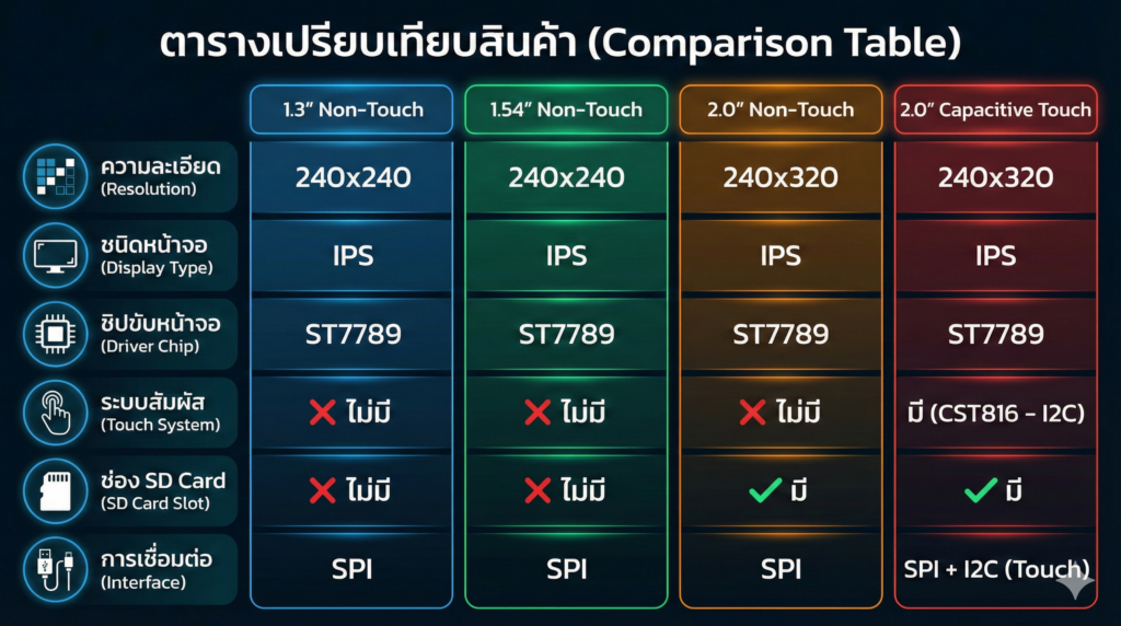 ในรุ่นขนาด 1.3″ และ 1.54″ จะเน้นความกะทัดรัด เหมาะสำหรับอุปกรณ์สวมใส่หรืออุปกรณ์แสดงผลสถานะขนาดเล็ก ส่วนรุ่น 2.0″ จะมีความโดดเด่นในด้านพื้นที่การแสดงผลที่มากกว่า และถูกออกแบบมาเพื่อการใช้งานที่ซับซ้อนขึ้นด้วยการเพิ่มช่อง SD Card เข้ามา ทำให้สามารถเก็บไฟล์รูปภาพ .bmp เพื่อดึงมาแสดงผลบนหน้าจอได้โดยไม่เปลืองหน่วยความจำของตัวประมวลผลหลัก สำหรับรุ่น Capacitive Touch จะให้ประสบการณ์การใช้งานเหมือนสมาร์ทโฟน เหมาะสำหรับเครื่องมือวัดหรือแผงควบคุมที่ต้องการการโต้ตอบจากผู้ใช้งาน