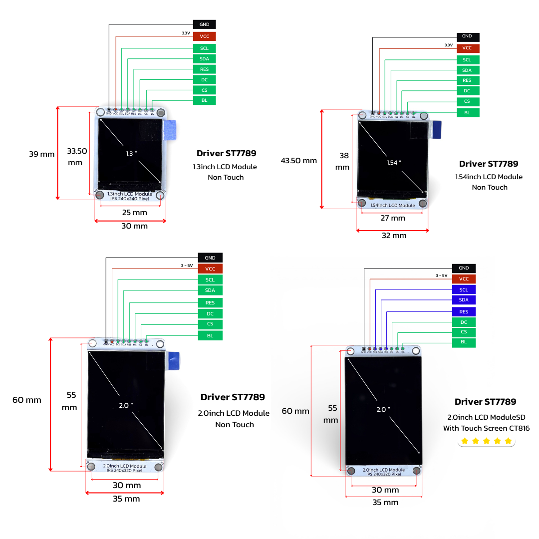 การใช้งานหน้าจอ TFT LCD 1.3″ 1.54″ 2.0″ สามารถใช้โปรแกรมเดียวกันได้ เนื่องจาก Driver ST7789 เหมือนกัน ทำให้ง่ายต่อการใช้งาน